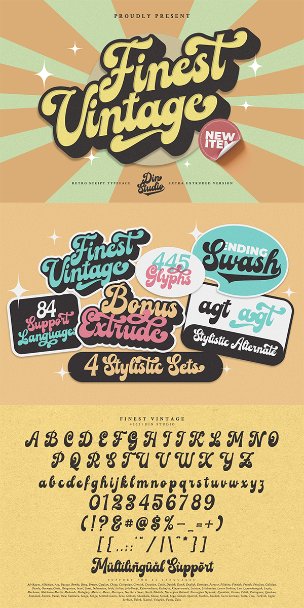 Finest Vintage is a beautiful font, employing the iconic bubble style with strong outlines and fat strokes. This font features thick and angular letters that easy on the eyes and nice to look while it’s also easy to read. It is well suited for making your logos really stand out. It comes with a range of multilingual glyphs and is one of those bubble fonts styles that’s hard to take your eyes off. The font becomes more special with extruding version option. Perfect to create amazing headings, logos, menus, social media graphics, and many more.