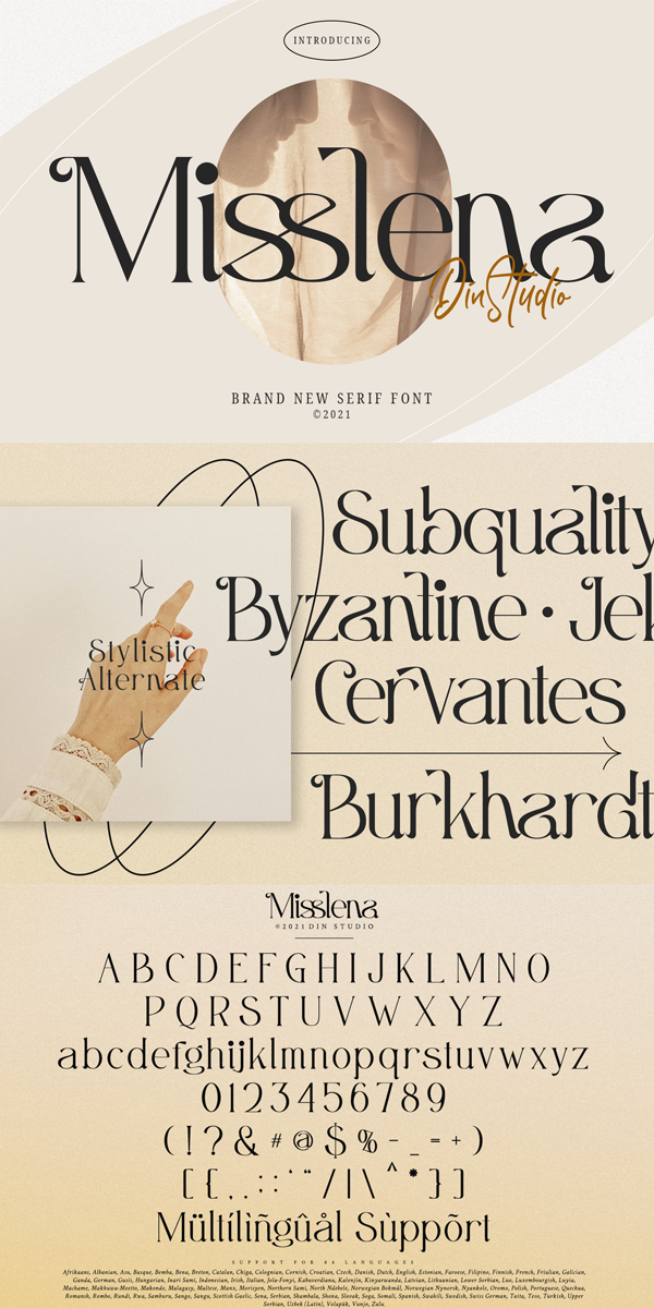 One of the most elegant, exquisite yet strong fonts. Misslena is made to bring out a modern and stylish view of what you make. This font contains upper & lowercase characters, all Punctuations, and numerals. Also Features include: ligatures and alternates characters to help the text flow naturally and add a custom-made feel. Its lighter weights are well-suited for body text. The available stylistic alternates offer a number of different characters that give your logo or business card a unique look.