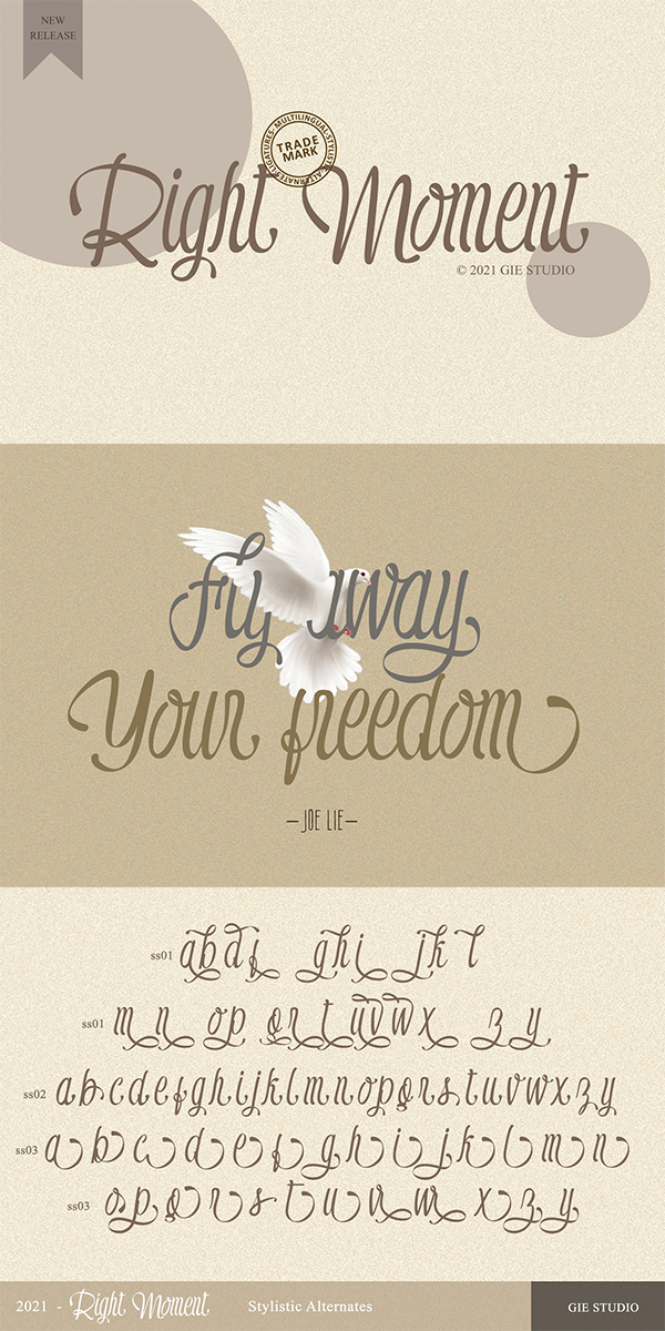 Right Moment is a romantic and sweet calligraphy typeface with characters that dance along the baseline. It will add a luxury spark to any design project that you wish to create! This font is PUA encoded which means you can access all of the amazing glyphs and ligatures with ease!