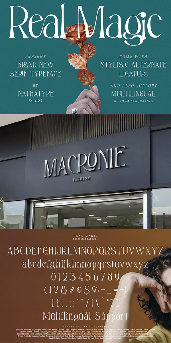 Serif Font: Real Magic Font, which is designed primarily to bring out a modern and stylish view to what you make. It contains uppercase and lowercase characters. Its light weights are well-suited for body text.