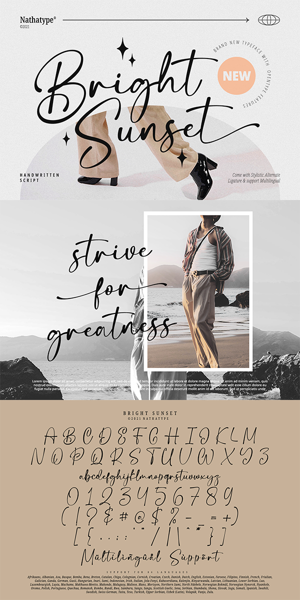 Bright Sunset font is a typeface that combines elegance and a modern style. An easy-to-read typeface, with a touch of character, the font is highly adaptable to the modern style to fit in whatever your project needs. Create gorgeous printed quotes, standout packaging, or beautiful t-shirts!