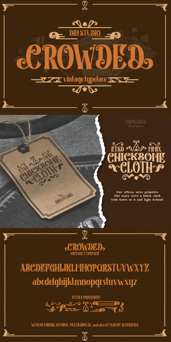 Crowded rounded vintage font. It was created by our talented artist with a full passion for vintage display. The font perfectly used on your website, media social, printed product, quotes, mugs, logos, poster, branding, t-shirt, and so much more!