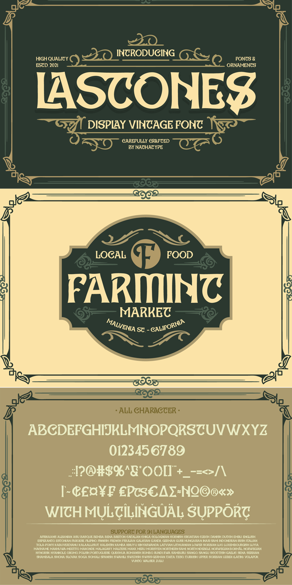 Lastones vintage font is a typeface that is made all characters in uppercase. An excellent choice to add the right amount of retro touch. This typeface with artistic style looks very interesting for loads of different projects and promotions. A great all-in-one package for your logo, book cover, poster, t-shirt, branding, and advertisement needs.