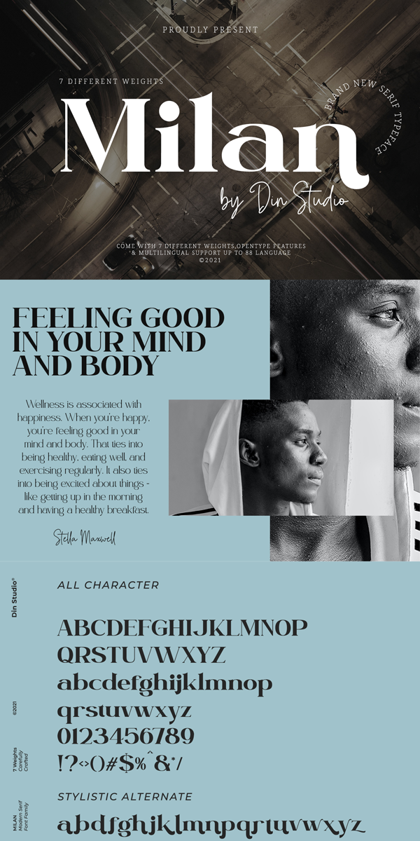 Milan is a package that will makes you super happy. We offer you a very best choice to coloring your branding or project. With this family you will get many options of weight to maximize your designs with stylish fonts. This serif font family made in uppercase and lowercase that easy on the eyes and nice to look while it’s also easy to read. The font is an excellent choice to ensure a great font match for your designs and projects! It also perfect to create amazing headings, logos, menus, social media graphics, and many more.