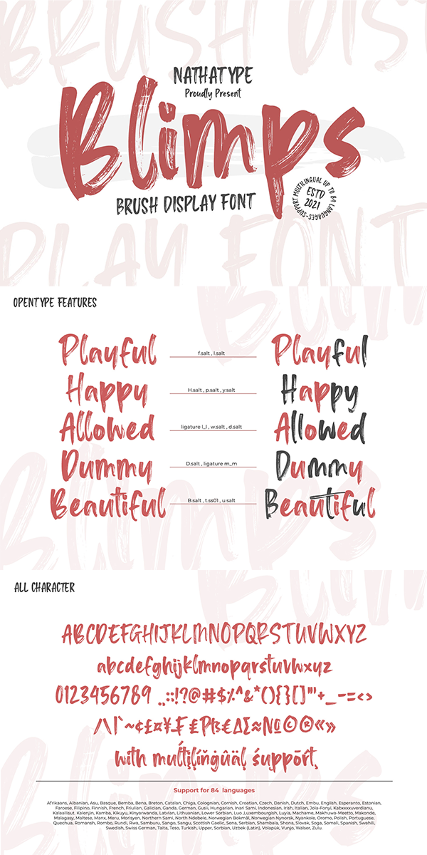 Blimps is a fantastic font. It is a display font combined from handcrafted script brush font. This is designed primarily as a captivating font to add the right amount of modernity and style. This font is an excellent choice to ensure a great font matching your designs and projects! It is well suited to titles, poster designs, branding, logos, etc.