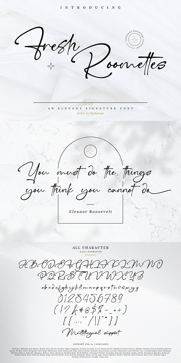 Fresh Roomettes is an elegant signature font. Every swash, stroke, and curve was created to entice happiness and elegance. The font is special in that one word can be written in a million different ways.