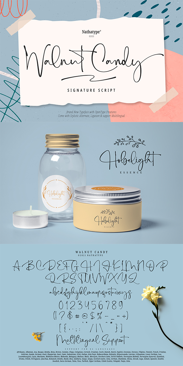 Walnut Candy is a handcrafted font designed to bring your branding to life and add a touch of elegance, modernity and style. It is perfect for social media branding projects, fashion designs, printed quotes, packagings, or even as a stylish text overlaying any background images.