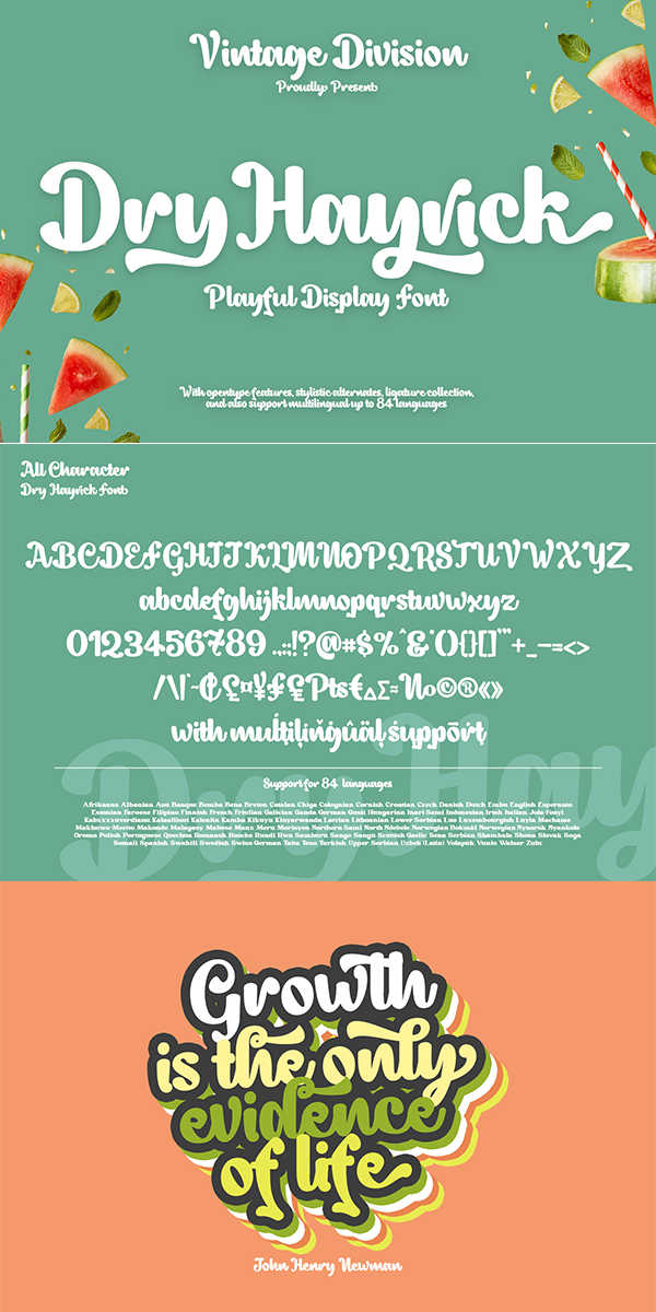 Dry Hayrick is a display font which is created to fit in your designs. This is an excellent choice to add the right amount of playfulness. This custom-made font is specially designed to meet any of your needs and is absolutely the perfect choice for creating your logo, book cover, poster, t-shirt, branding, and advertisement.