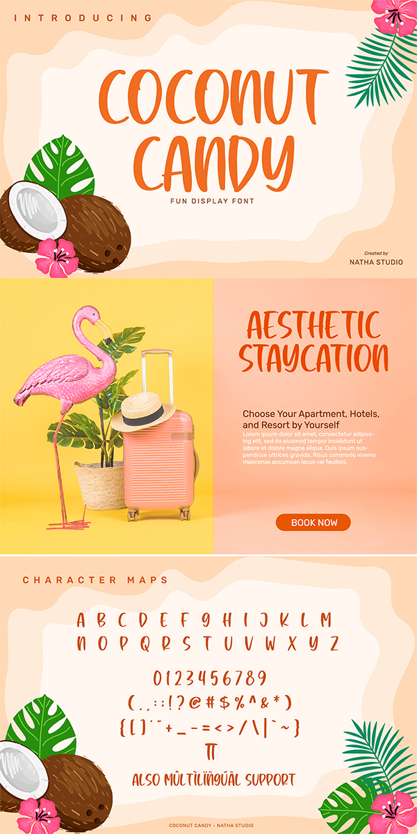 Coconut Candy is a fun display font. It brings a beautiful and attractive typeface. Made for any professional projects. This font will look amazing in wedding invitations and greeting cards to social media quotes, branding, and more!