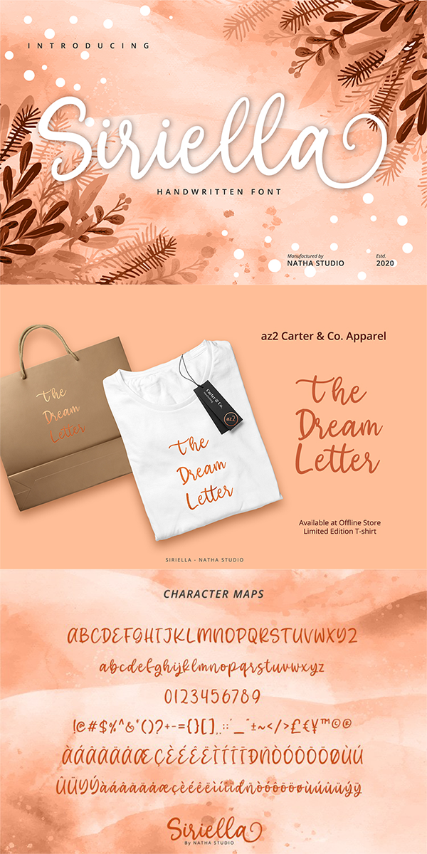 Siriella is a beautiful handwritten font. It brings an attractive typeface. Made for any professional projects. The font is suitable for any project like logo, t-shirt printing, wedding invitations, and greeting cards to social media quotes, branding, and more! Outstanding in a wide range of contexts.