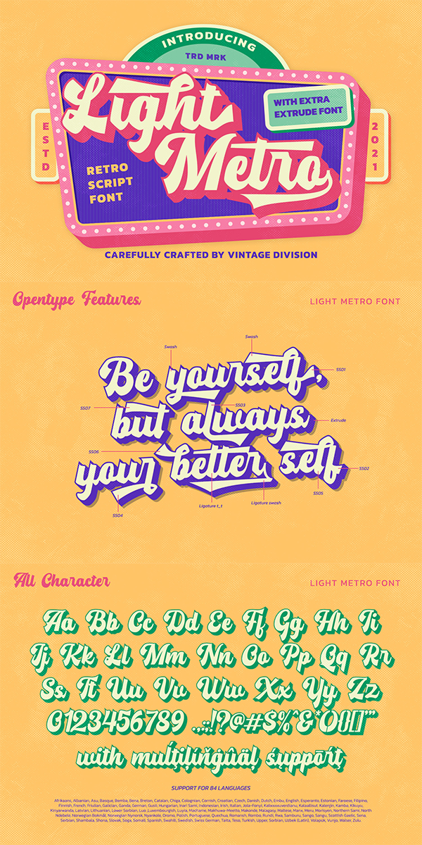 Light Metro is a captive font designed with strong outlines and fat strokes to bring your branding to life and add a touch of vintage, fun, but still stylish. Inspired from pop 1960-1970s. This font features thick and angular letters that easy on the eyes and nice to look while it’s also easy to read. Light Metro becomes more special with extruding version option. Perfect to create amazing headings, logos, menus, social media graphics, and many more.