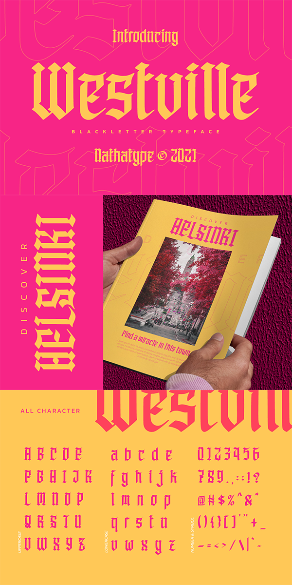 Westville is made to bring out a modern and stylish view of what you make. This typeface with artistic style looks very interesting for loads of different projects and promotions. A great all-in-one package for your logo, book cover, poster, t-shirt, branding, and advertisement needs.