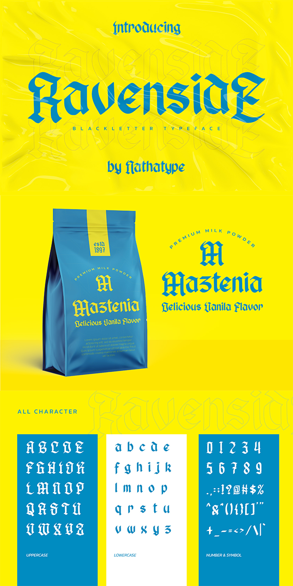 Ravenside is made to bring out a modern and stylish view of what you make. This typeface with artistic style looks very interesting for loads of different projects and promotions. A great all-in-one package for your logo, book cover, poster, t-shirt, branding, and advertisement needs.