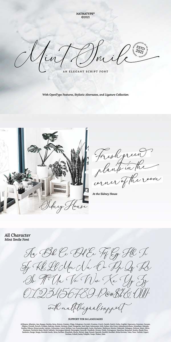 Mint Smile is an fresh and modern script with a handmade calligraphy style. Perfect for adding a touch of whimsy to your already amazing designs. This font is perfect for branding projects, home appliance design, product packaging, use in business cards, invitation cards, etc. Simply as a stylish text overlay onto a background image or anything that requires a touch of elegance.