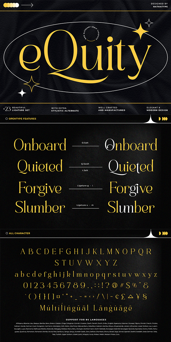 EQuity is a modern, luxury, but still authentic serif font. This font is perfect for branding, logos, wedding stationery, cards, gift designs, photography, watermark, product packaging and quotes. You won’t get cute, whimsical, funny logos with this font. Only high-end, upscale, sophisticated Branding Design.