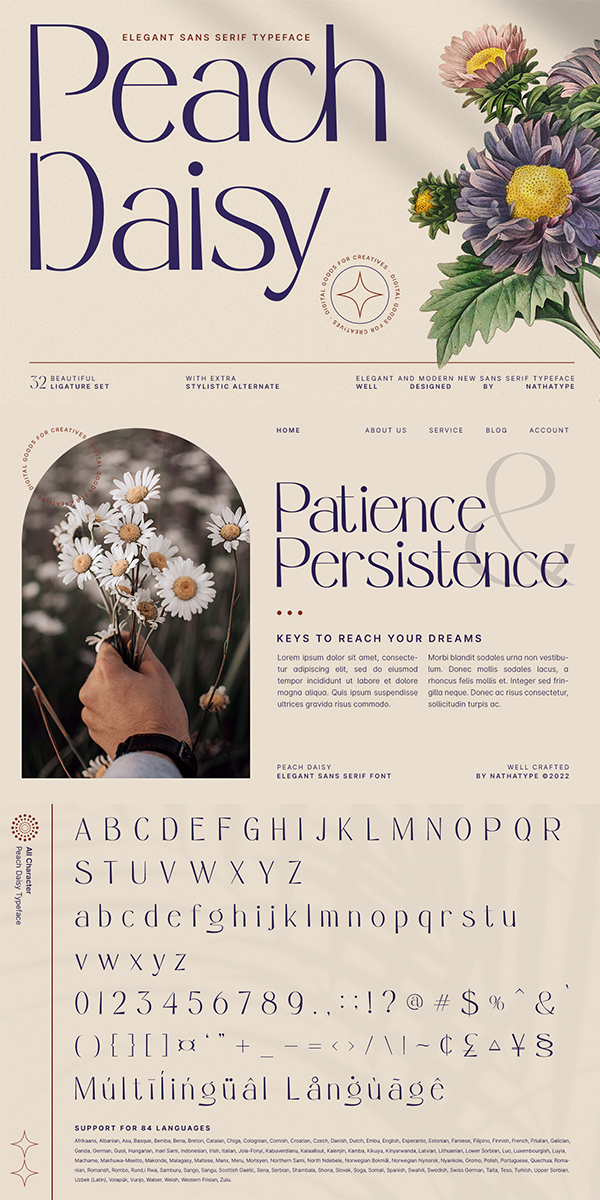 Peach Daisy is a new modern sans serif font. This font was carefully crafted and inspired by luxury fashion in the world. It creates a luxurious, rich, exclusive and elegant look in design. It’s thin brush strokes and imperfect baseline give it a fun and stylish. So beautiful on invitation like greeting cards, branding materials, business cards, quotes, posters, lettering and more.