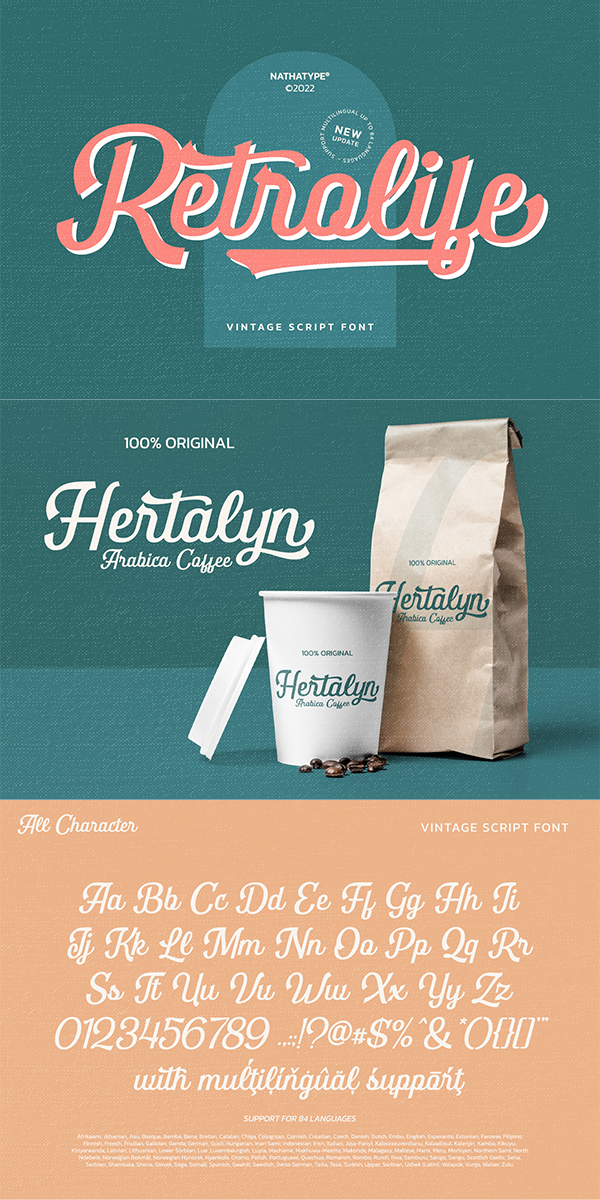 Retrolife is a interesting blend of retro and a bit of modern style script font. This font is very easy to read, because there are many fancy letter joints. Perfect to be applied in various formal forms such as invitations, labels, restaurant menus, logos, fashion, make up, stationery, novels, magazines, books, greeting / wedding cards, packaging, labels or all kinds of advertising purposes.