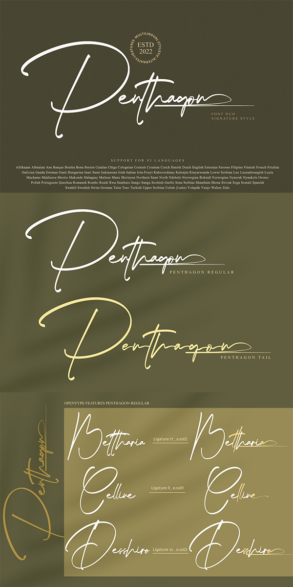 Penthagon is Script Font Duo with elegant and signature style, that are very beautiful,luxurious,and high class for creating handwritten-style logos, wedding stationery, photographer watermarks logos, modern websites, fashion branding, name card, wedding invitation, and all the identity of your business products.