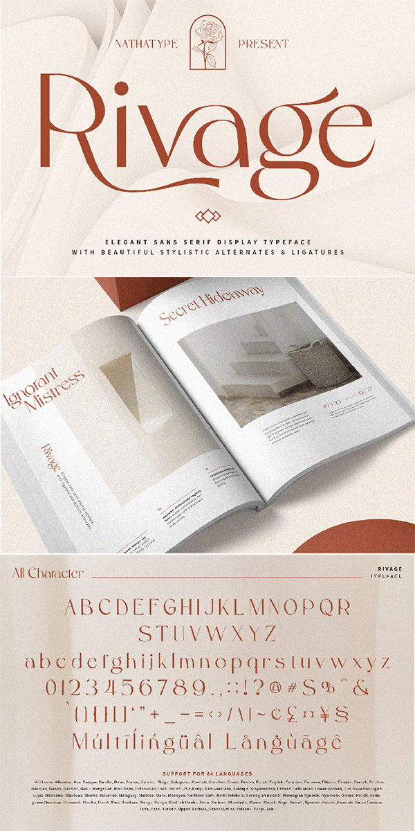 For a dramatic design result, you can take it up a notch with our lovely font, Rivage. It is an elegant sans serif font. This font is quite enigmatic, in that its geometric but also has an open curves. The result is a font that looks friendly and professional at the same time. Also, Rivage is versatile enough to be used on tittle or body text.