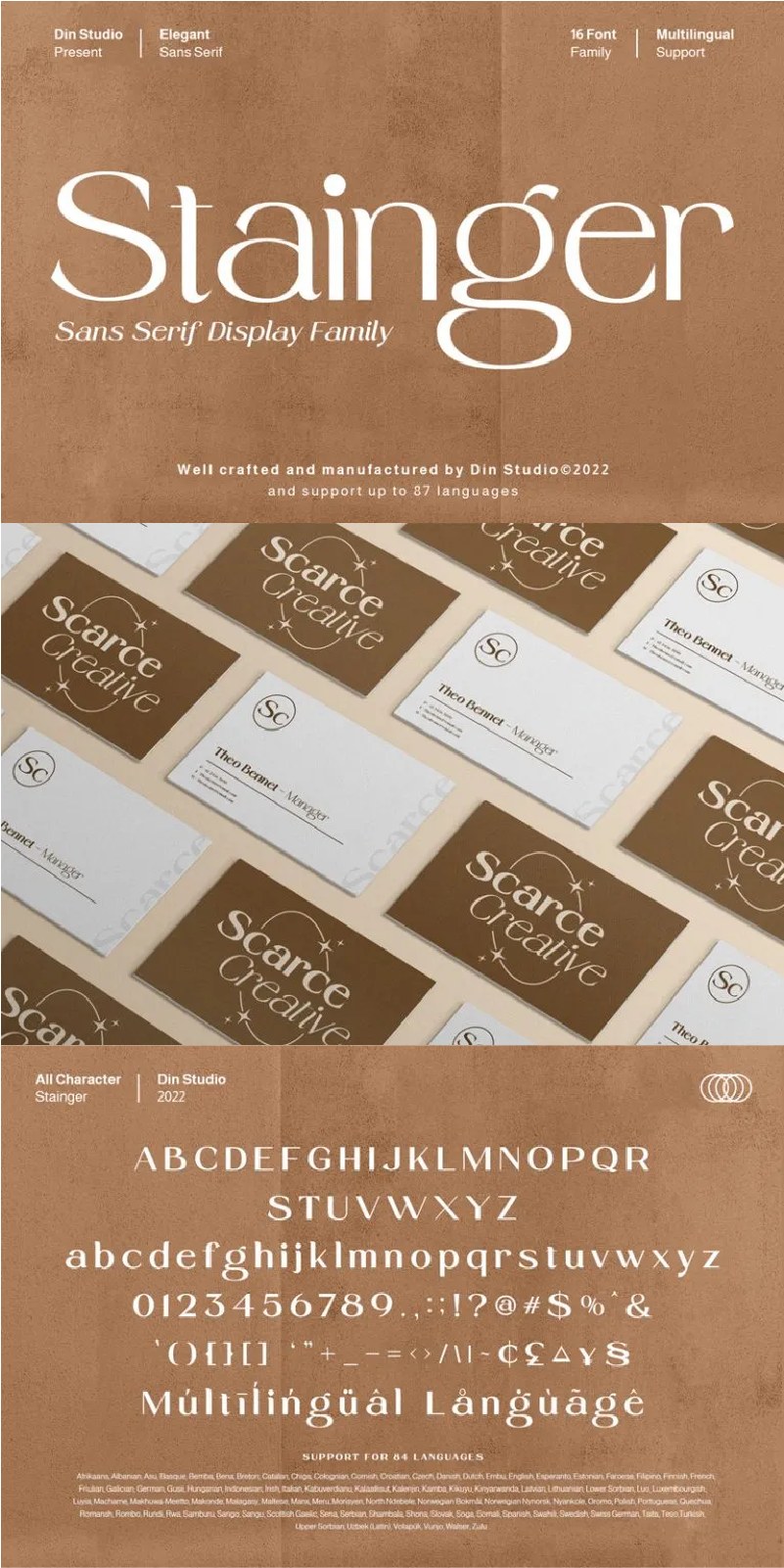 Stainger. Carefully crafted to meet your needs, provides new ways to express and escalate your designs better. It is a simple, calm yet modern font family featuring 16 different weights such as light, heavy, tilt and other style types. Its legibility and simplicity make it possible to work for both header and body text. Therefore, it freely lets you use the font in any way you like.