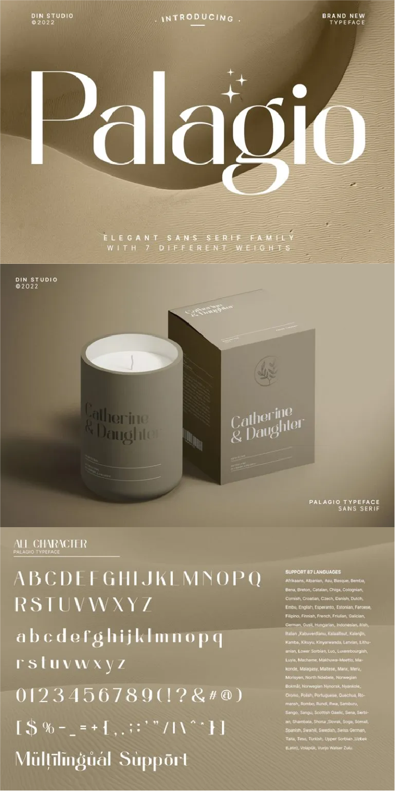 Palagio is a package of sans serif font to please you. This font family expresses simple, warm, modern styles presented in 7 varieties of weights from thin to extra bold applicable for any text size due to its great legibility.