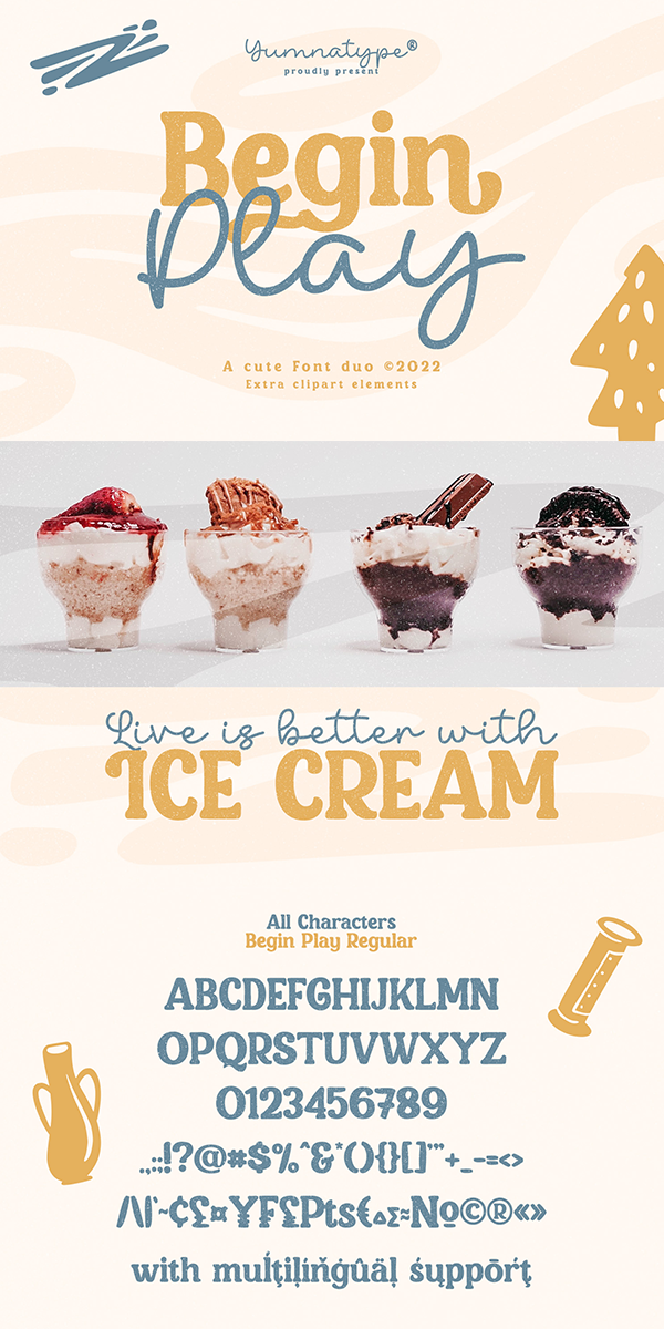 Begin play is a font duo made from combination between script and display font style you can mix, match, and call your own. The script style has a cute touch that is well pair with the elegant sans serif font. This font duo maintain the readability even at small sizes.