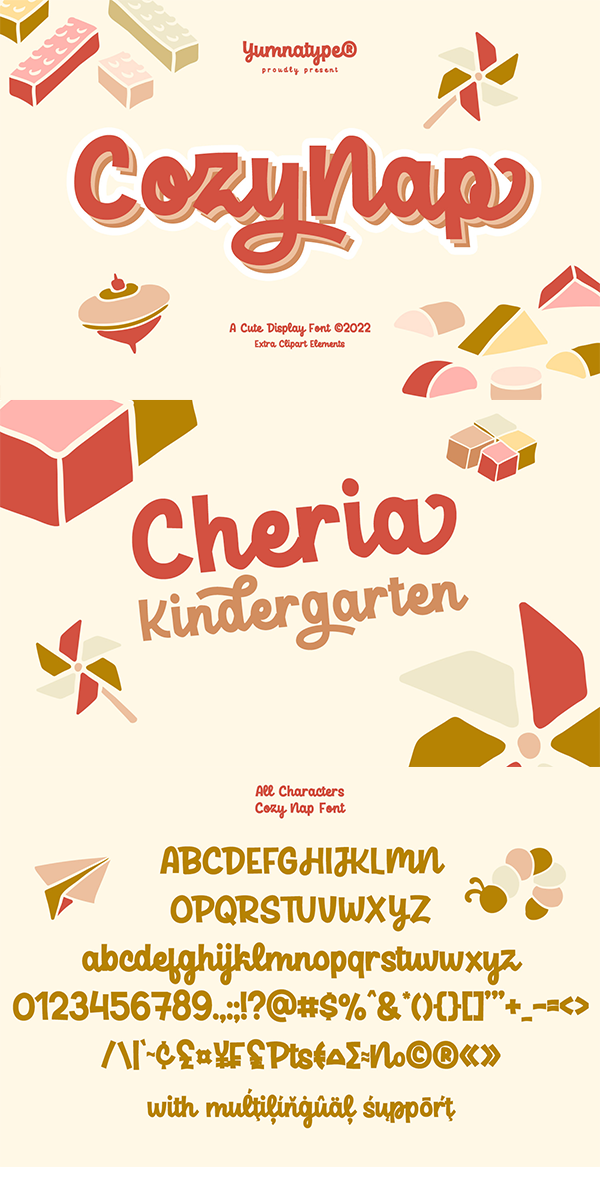 Cozy nap is a cute display font. The dramatic bold and heavy styles works well in header or title text. While it’s easy to read, there are also a little bit curvy characters to add cute vibes. This font becomes more special with illustrations as the extras.