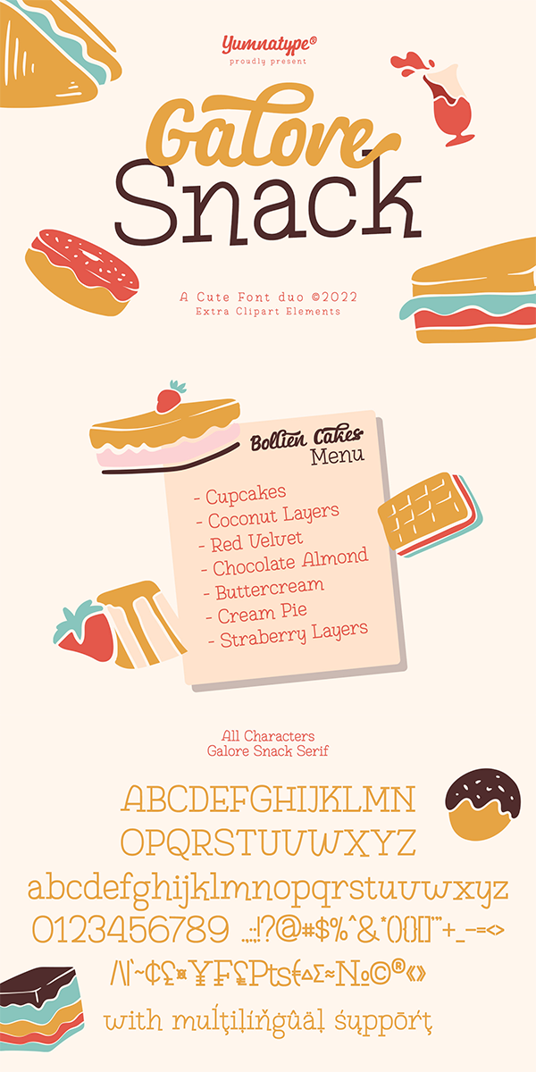 Galore Snack-with the combination between script and display font styles you can mix, match, and call your own. The script style generates modern and elegant vibes with its curvy strokes. Through the display font, it creates simple, clean yet versatile looks. This harmonious font duo supporting and advocating each other to make awesome result in your design. You also get 15 illustrations as special extra that you can use as you wish.