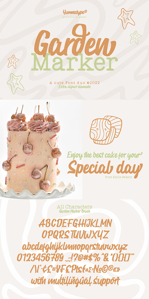 Garden Marker is a beautifully designed font duo to add distinctive touch wherever they are used. This duo projects warm, friendly energy, elegant, as well as slightly cuteness feel. It is versatile enough to be used as title, body or button text. Furthermore, this font duo also offers a special extras i.e. 15 illustrations in total.
