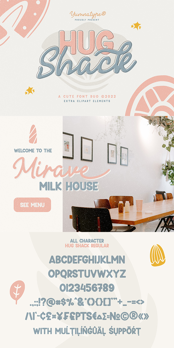Hug Shack expresses a feeling of joy and cute overall. Through the script font, Hug Shack brings your design to delve deep into the world of cuteness, while the display font creates modern look. You can mix and match this harmonious font duo to make gorgeous result in your design. This font become more special with awesome clipart as bonus.