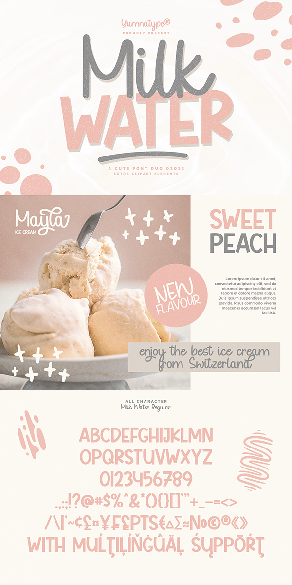 Milk Water, a beautiful font duo. Through the display font, Milk Water generates friendly energy as well as slightly playful aesthetic while the script font style allows us to get modern and elegant looks. The result of the combination is warm and cute at the same time. As special extra, we give you many illustrations that you can use whatever you want.
