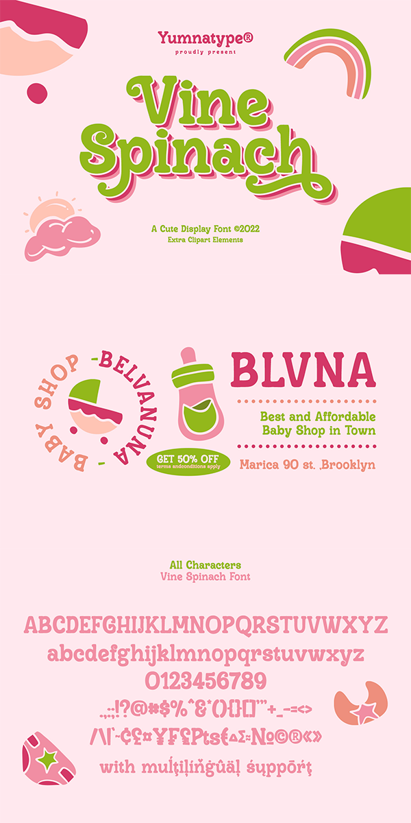 Vine Spinach is a beautifully designed display font. The round and shadow style applied to the characters gives this font cute feel. While it’s easy to read, the dramatic bold and heavy style is very suitable to be used to create titles and logos. You also get illustrations as special extra that you can use as you wish.