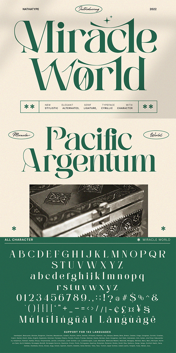 Miracle World is an elegant serif font to level up your design into something miracle. It can never go wrong to be applied in any purposes. The weight of the font was designed to bring strength to any title/header. On the other hand, the curves of the characters convey a sense of elegance. It is also has fascinating features that helps you maximize your design.