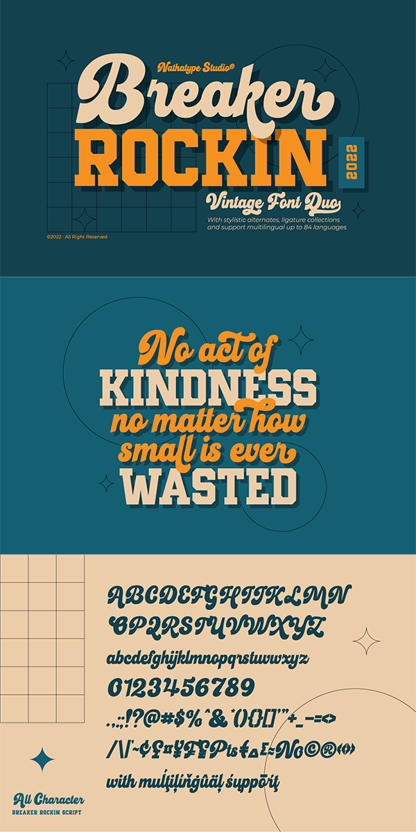 With Breaker Rockin, you will not have problems in terms of lack font options. It is a versatile font duo that brings your design result vintage looks. The display font comes all in uppercase characters makes this font easy to read, while the script font shows bold and curvy strokes. You can mix and match this harmonious font duo to make gorgeous result in your design. Even more, this font duo has fascinating features that allows you maximize your design.