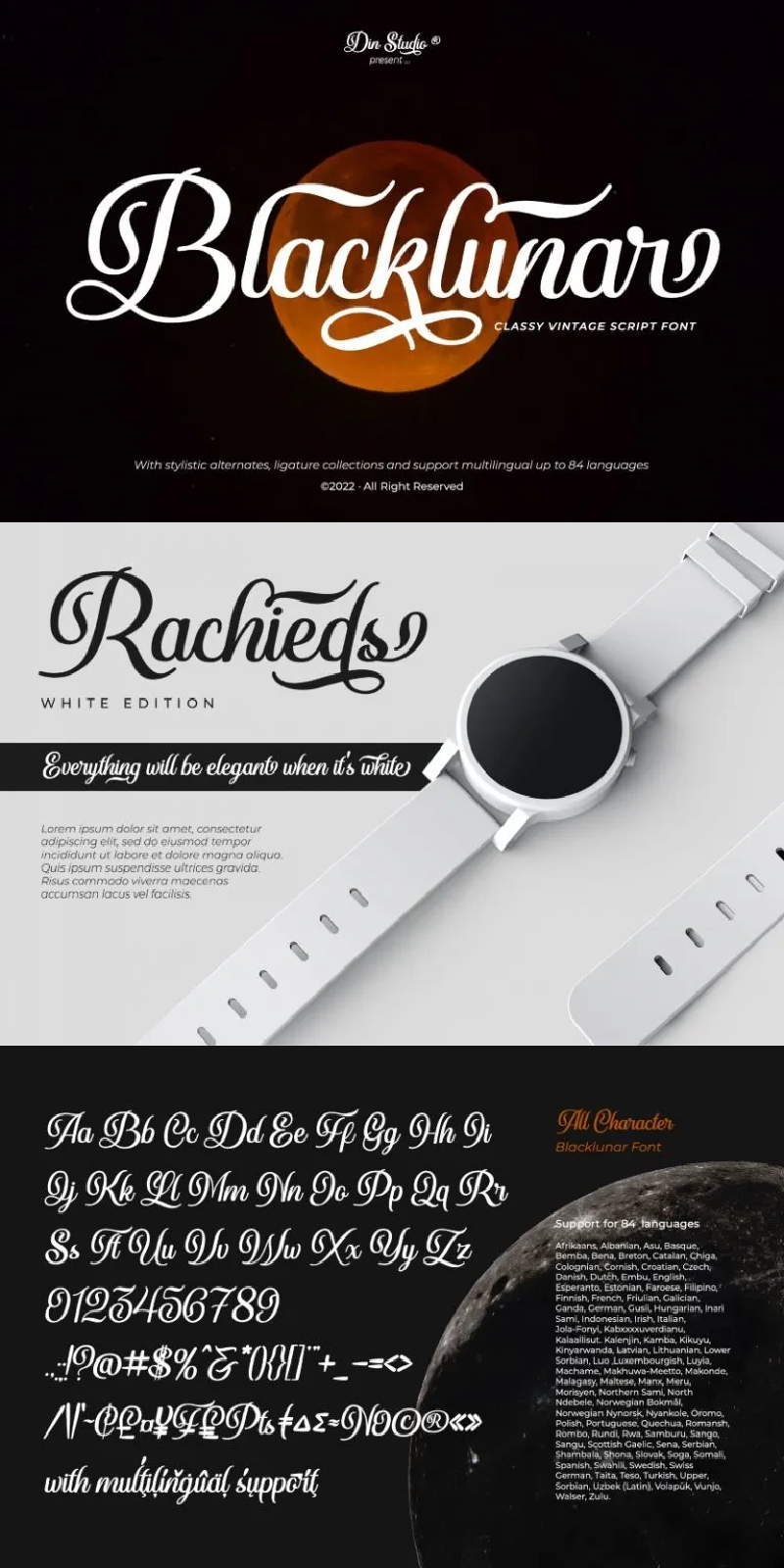 Blacklunar is a script set to captivate. Truly a style statement script font for your vintage vibes that will make heads turn. It’s easy to read and works equally good as well in header and body text. The curvy and unique strokes at some particular characters give this font the sense of vintage. Additionally, this font has interesting features that can helps you with your design.