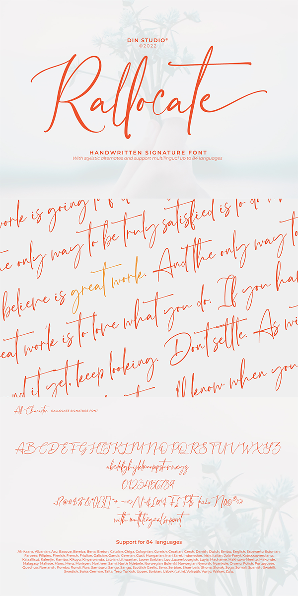 Expect nothing but brilliance for your design. It’s a perfect way to maximize your productivity and enjoy the comfort of designing process at its best. Meet Rallocate, a wonderful script font that looks like signature, with beautifully contrasting thick and thin strokes. Each letter looks neat and carries some elegance. This font will look equally good in the header or smaller text. In addition, it has more fascinating features to create your amazing design.