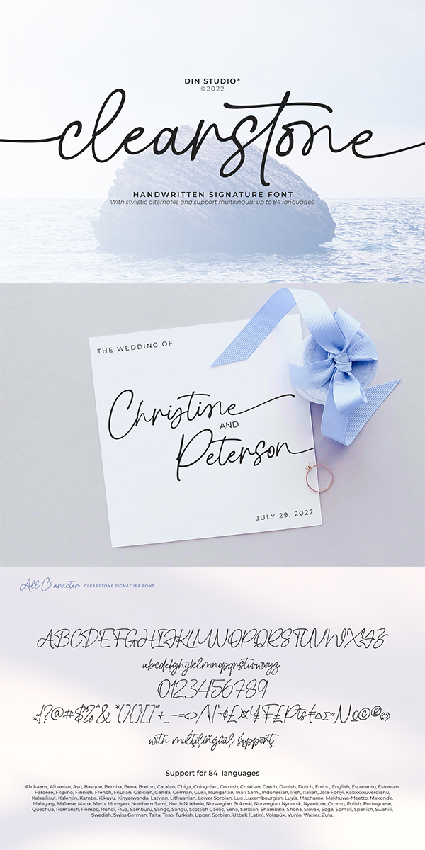 With Clearstone, you can showcase a delightful yet fancy viewing experience that may powerfully highlight your values and communicate well with your customers. Clearstone is a script font that resembles the actual handwriting style. This font is elegant, readable, and has a timeless quality that never goes out of style. Furthermore, this awesome font has fascinating features that allows you maximize your design.