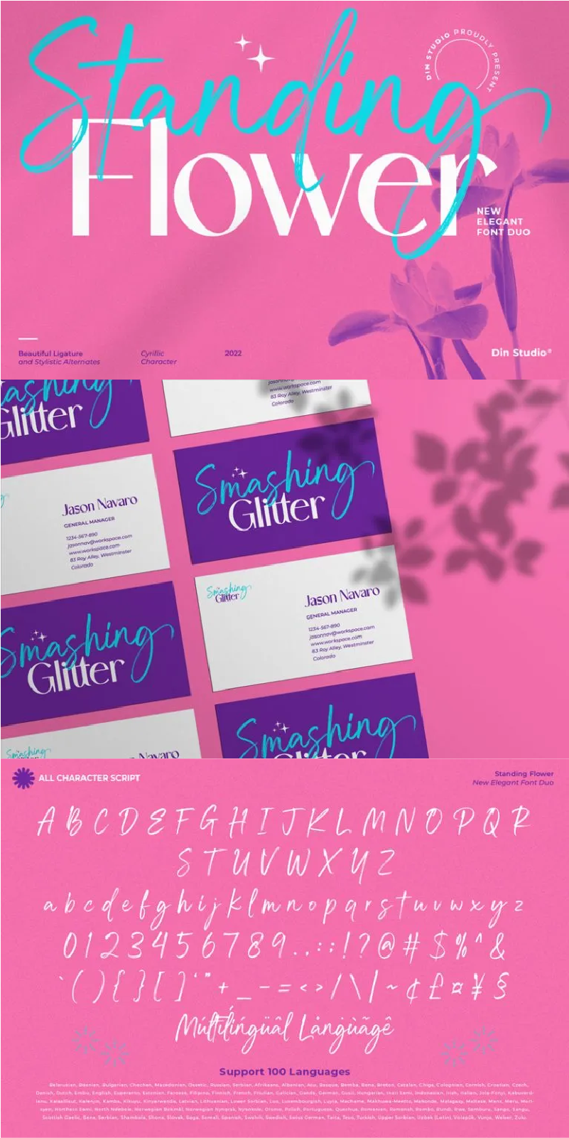 Standing Flower, a must-have item for your designs, is a handmade script font combined with a soft sans serif font to meet your needs. This script font, as well as the sans serif font, expresses elegant, modern impressions and natural nuance together thanks to many unconnected letters, as if they were not written down in a cursive style, and add some unique curves to the letters.