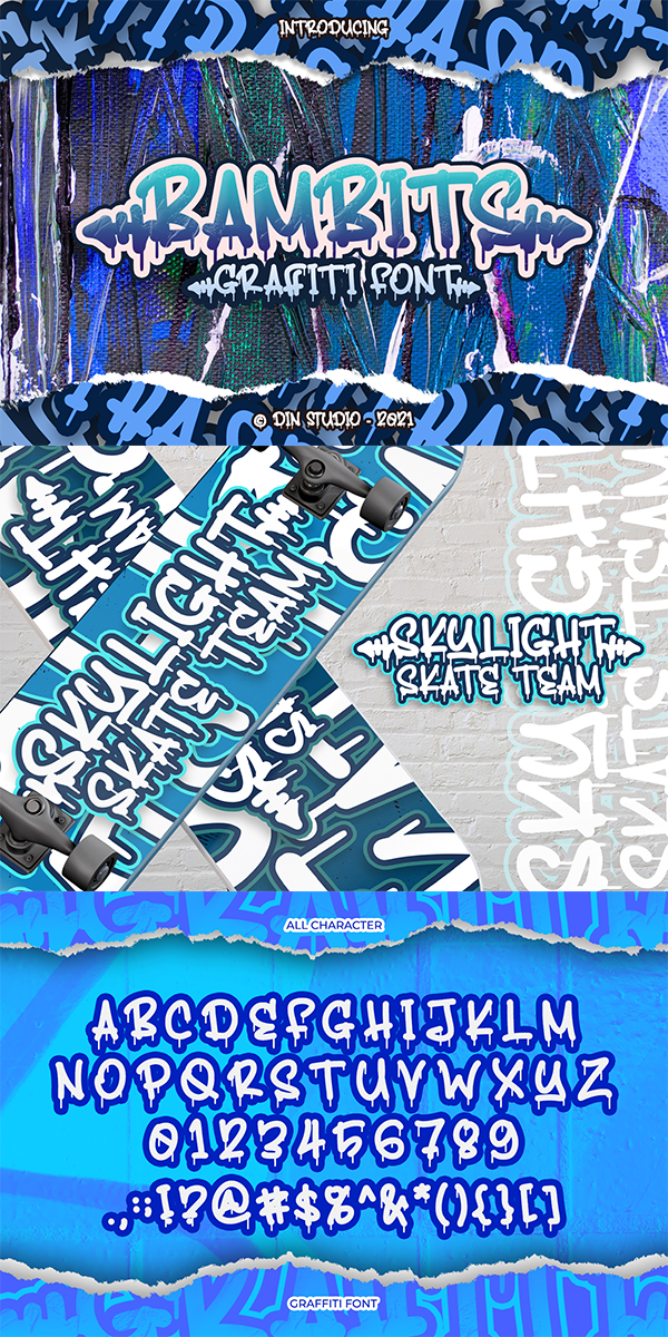 Bambits is a typeface that combines the bold bubble font design, with the graffiti aesthetic. An easy-to-read typeface, with a touch of character, the font is highly adaptable to the gritty urban style, and the dark vibe, to fit whatever your project needs. Create gorgeous printed quotes, standout packaging, or beautiful t-shirts!