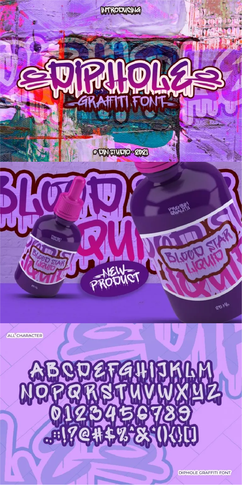 Diphole is an aggressive urban graffiti-styled typeface all in uppercase that’s bursting with youthful energy. Beautifully designed with bold bordering, the font will work to stand out in any creative project. This graffiti font is the best to maximize the amount of street vibe and playfulness. Ideal to create amazing headings, logos, menus, and social media graphics.