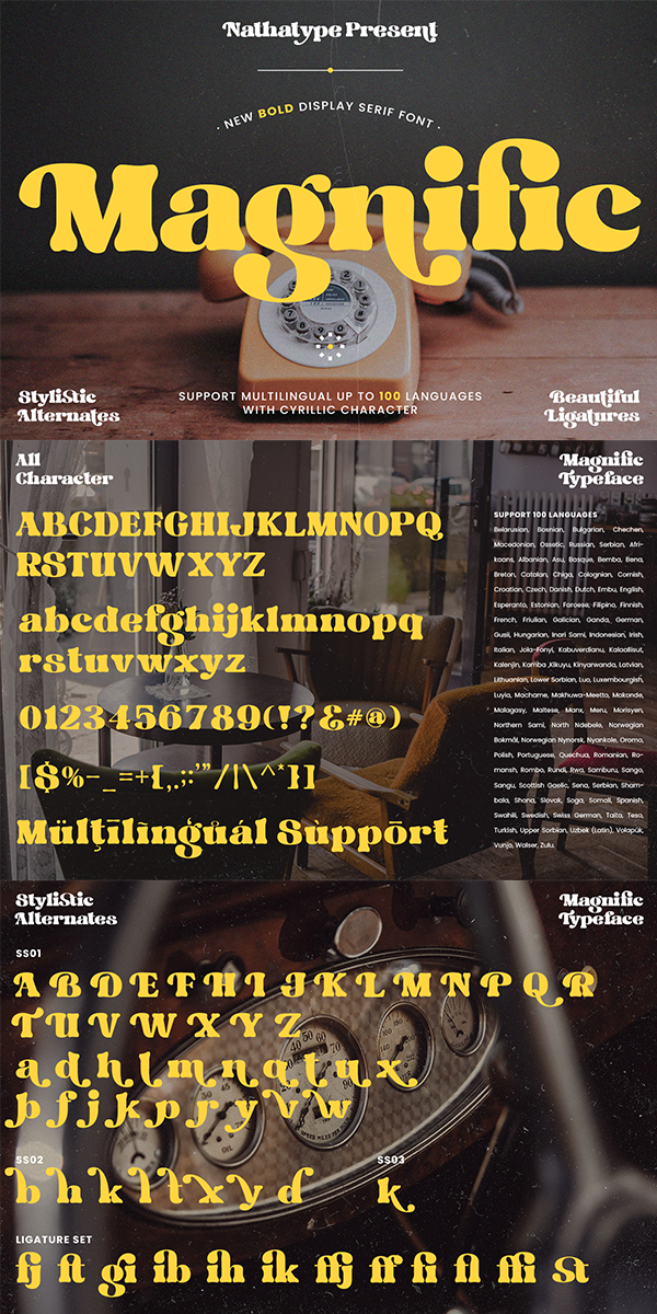 Magnific includes upper and lowercase letter and full set of glyphs. It works perfectly for for many design projects, such as poster, logo, book cover, branding, heading, printed product, merchandise, quotes, social media campaign, etc. This font also contain multilingual support to help your brand reach a global audience.