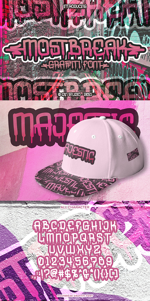 Mostbreak is an uppercase typeface that combines the elements of a graffiti style, with a cute bubble aesthetic. A great display font that appears to drip down on the page, as if sprayed there only moments ago. Well suited to titles, poster designs, branding, and logos.