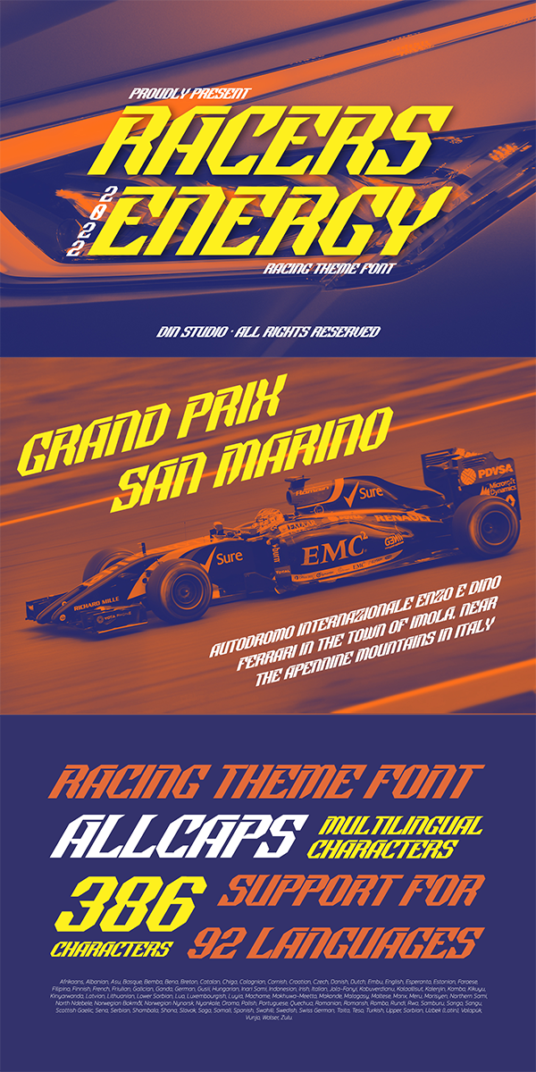 Racers Energy is a font created in capital letters with the racing theme producing courageous strong impressions in no time making it worth adding to your design list. Letters are made similar to firm rectangle blocks with sharp-angles. Enjoy other incredible features available on this font.