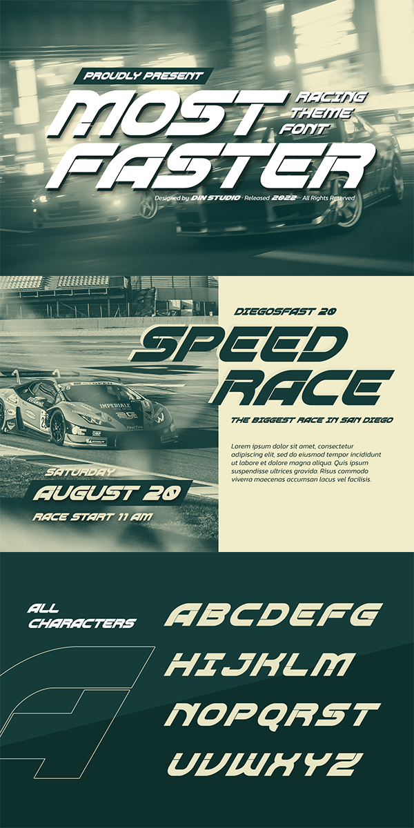 Use Most Faster for any design projects such as posters, banners, logos, book covers, headings, printed products, merchandise, social media, and so on. Find out more ways to use this font by taking a look at the font preview.