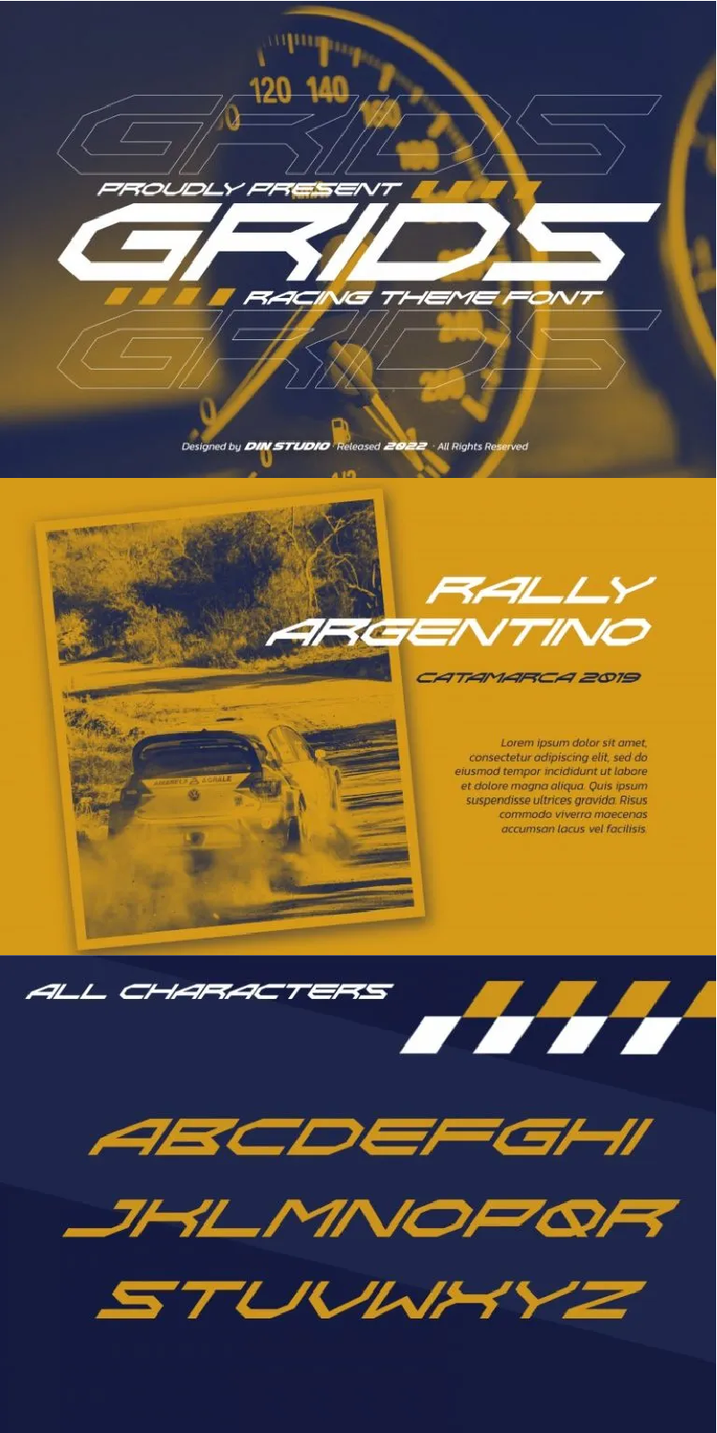 Grids is a display font designed in a racing theme showing a firm display and a sharp angle in each letter to give a unique attractive impression. Additionally, it provides interesting features to help designers maximize their design products. Use Grids for any design projects such as posters, banners, logos, book covers, headings, printed products, merchandise, social media, and so on.
