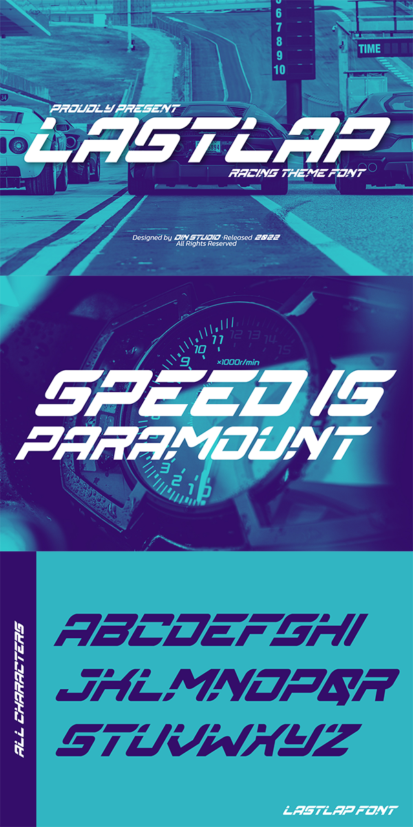 Experience the amazing feeling with Lastlap that will make your work a lot easier than before. It is a display font designed in a racing theme. In accordance with its theme, Lastlap expresses a brave feeling with its dramatic bold style suitable to use in titles, logos, and any other designs with large-sized texts. Enjoy other incredible features available on this font.