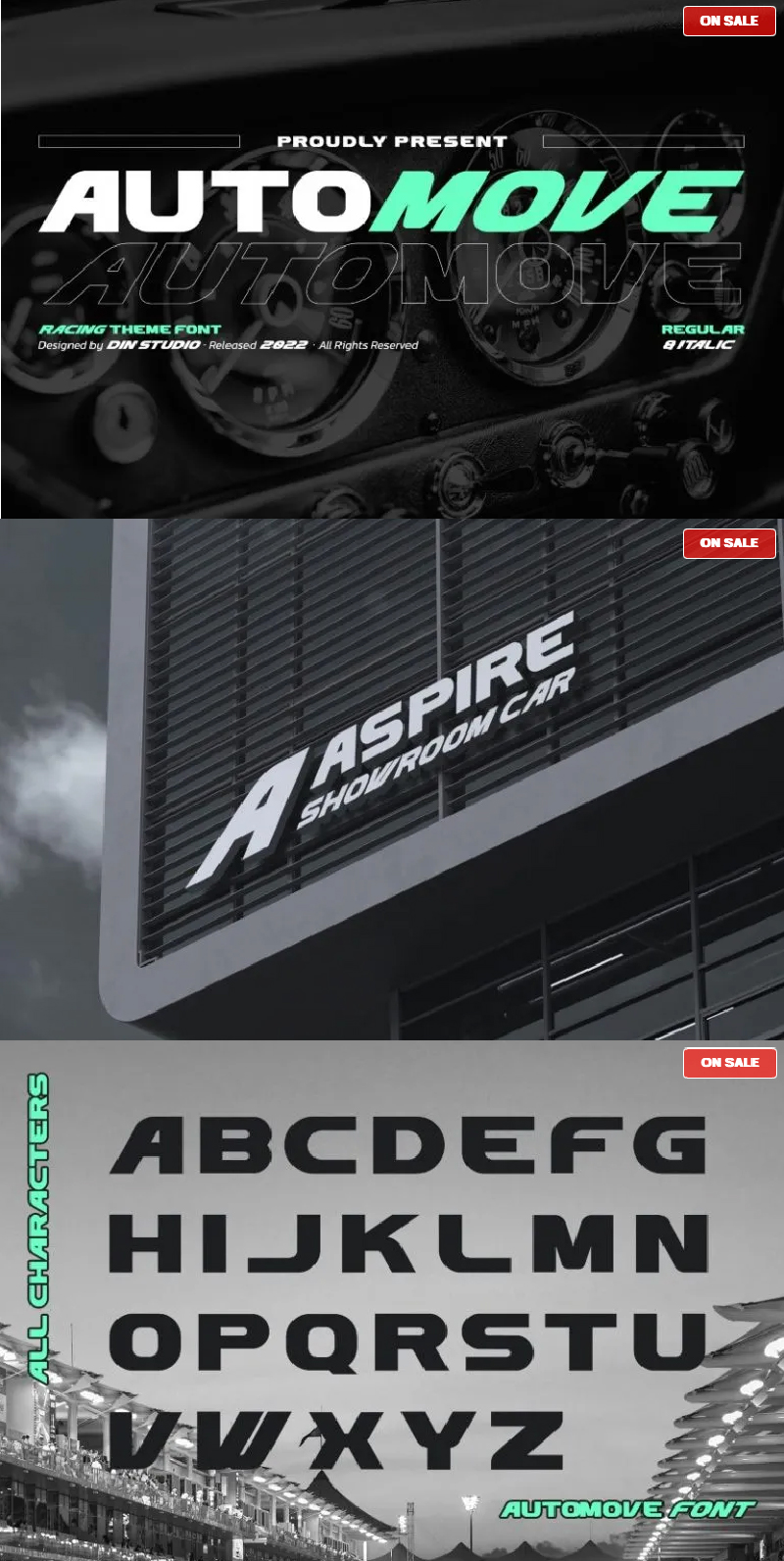 Automove, a display font in the racing theme capital letters, is carefully and accurately created to meet your design needs. This font is available in two versions, regular and italic. Automove, which seems to be a long lasting font amid other typographies owing to its unique styles and shapes, is generally applicable to large-sized texts in titles instead of the contents of the texts due to its readability in such