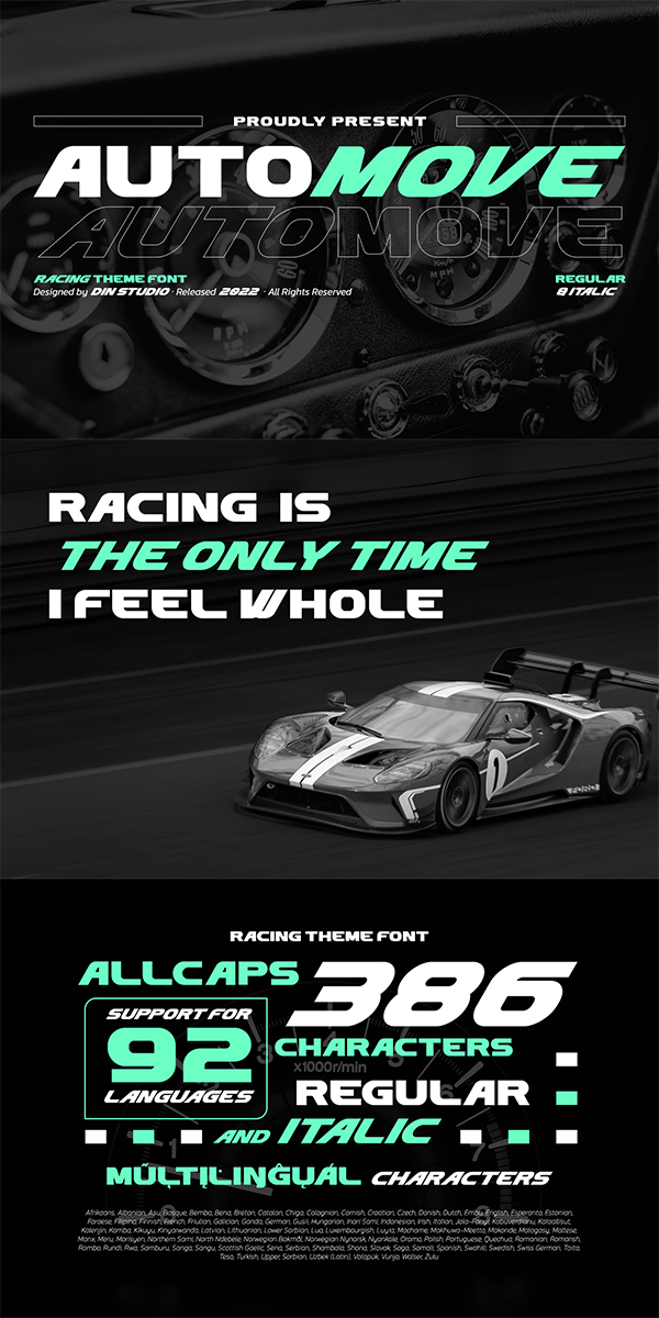There are a lot of considerations when selecting a font type for an important project either for your own company or a daily used font. Therefore, Automove, a display font in the racing theme capital letters, is carefully and accurately created to meet your design needs. This font is available in two versions, regular and italic. Automove, which seems to be a long lasting font amid other typographies owing to its unique styles and shapes, is generally applicable to large-sized texts in titles instead of the contents of the texts due to its readability in such large-sized letters. In addition, this font provides interesting features to help designers improve their design products.