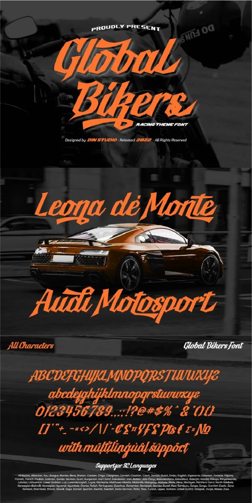 Global Bikers, a racing-themed script font made in thick displays. Unlike other useful cursive fonts looking similar to hand writings, this font really fits into bigger-sized texts. It is ideal for any design, including branding, fashion, printed templates, quotes, weddings, and more.