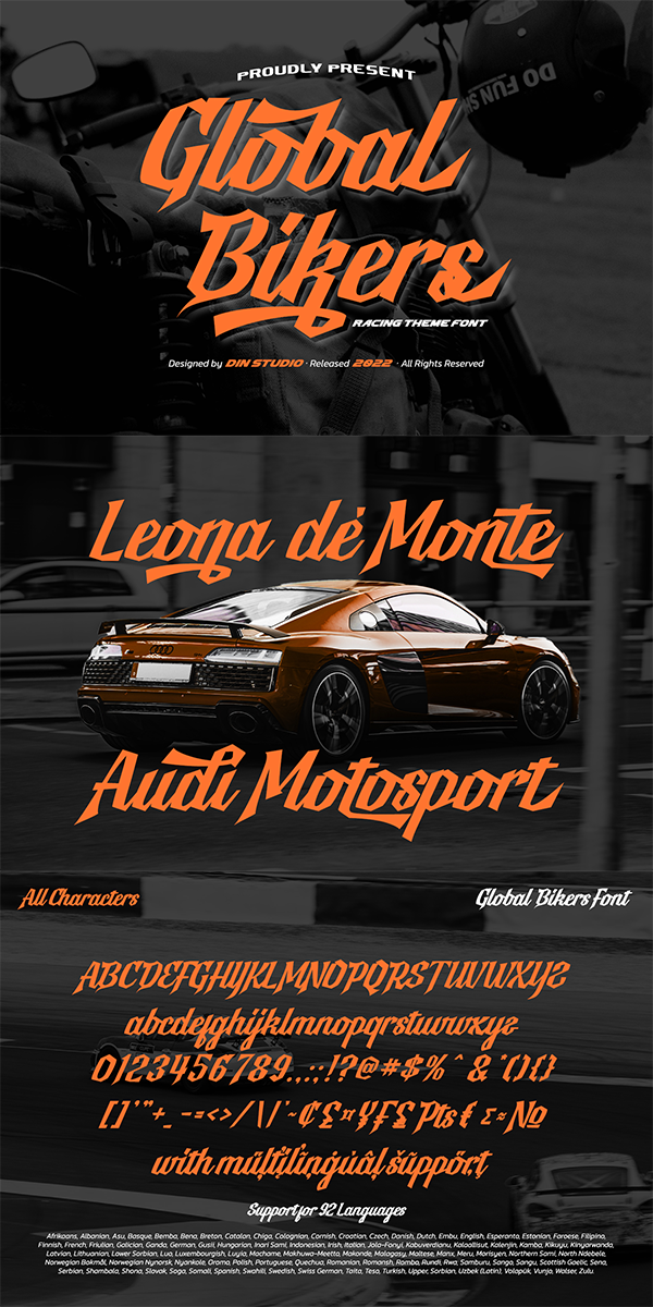Global Bikers a racing-themed script font made in thick displays. Unlike other useful cursive fonts looking similar to hand writings, this font really fits into bigger-sized texts. The available features in this font are: